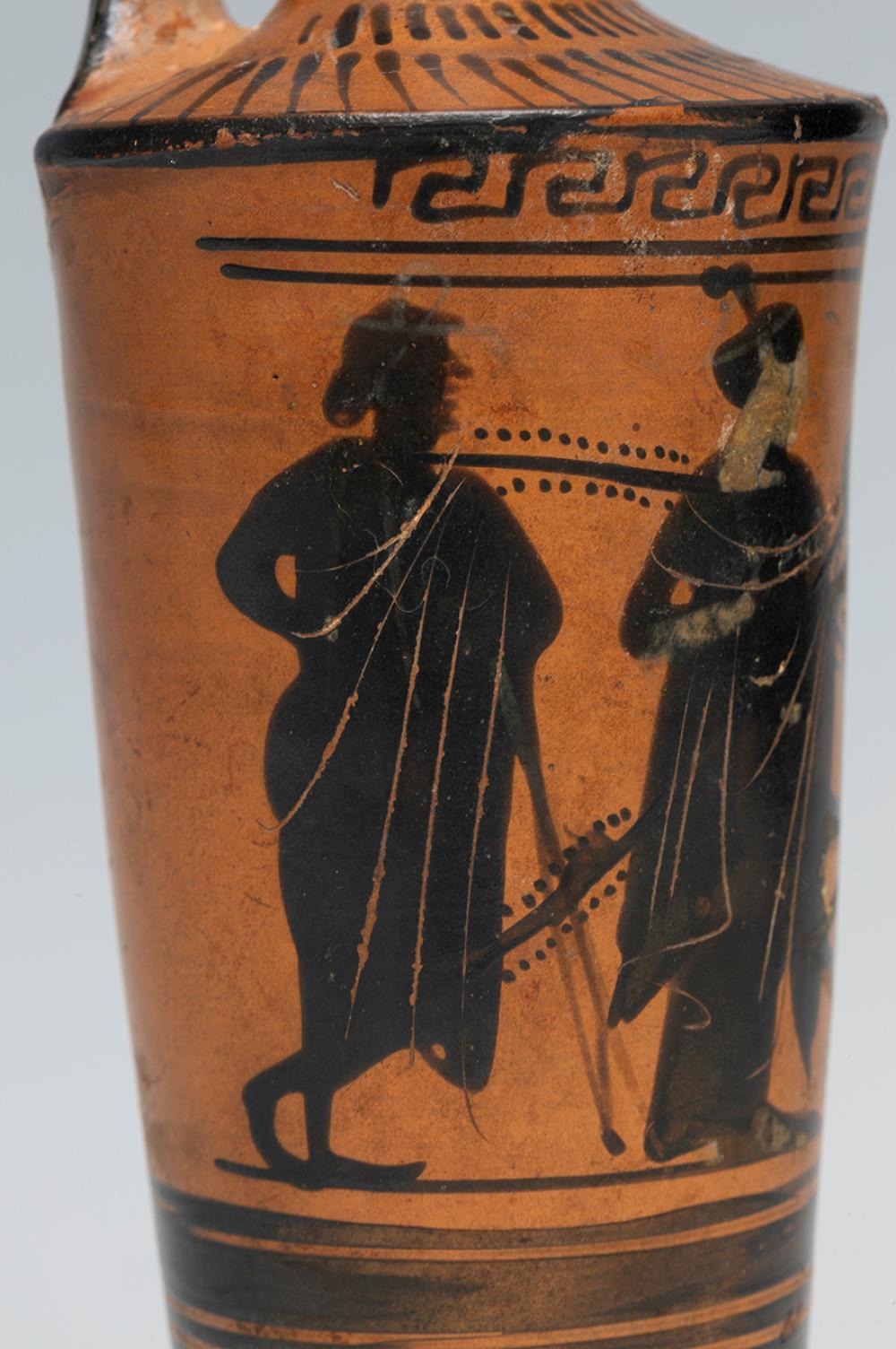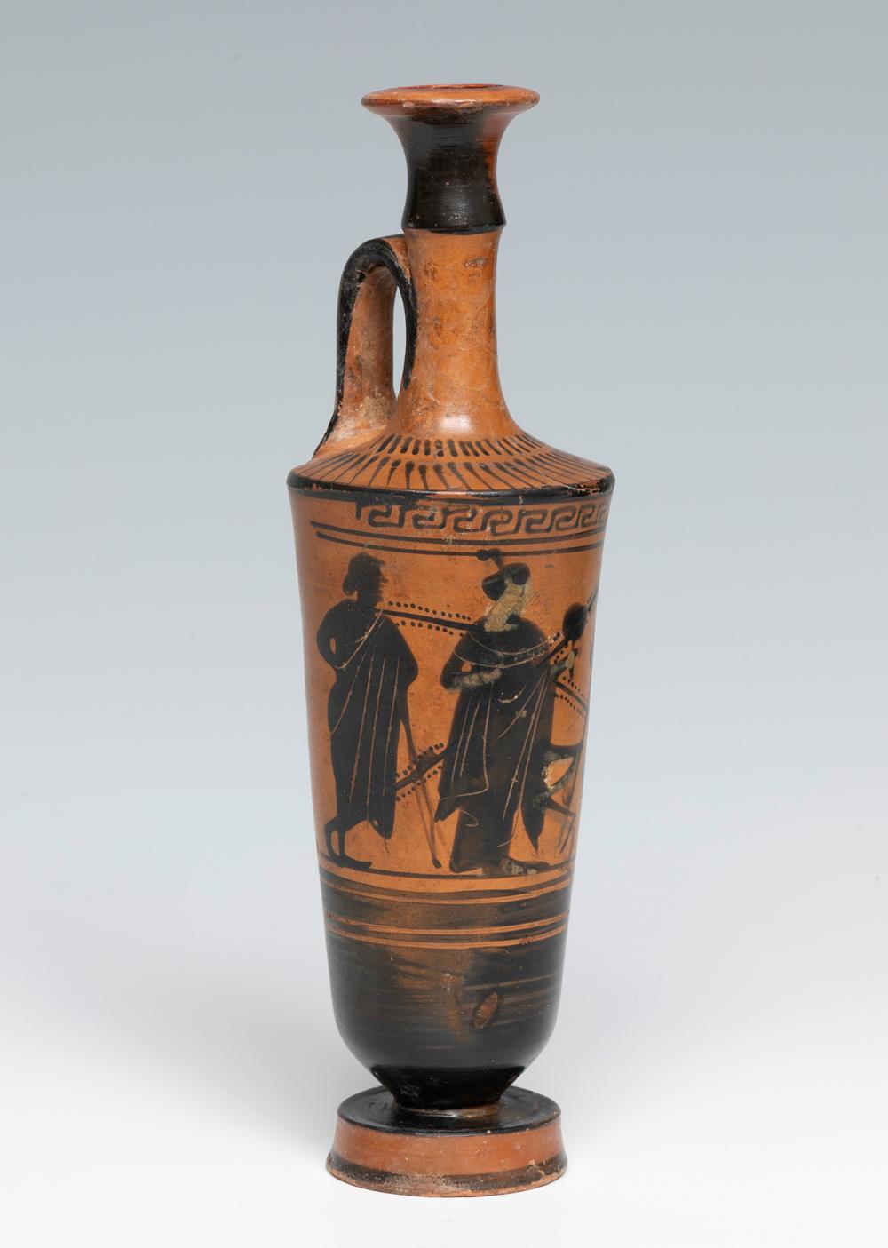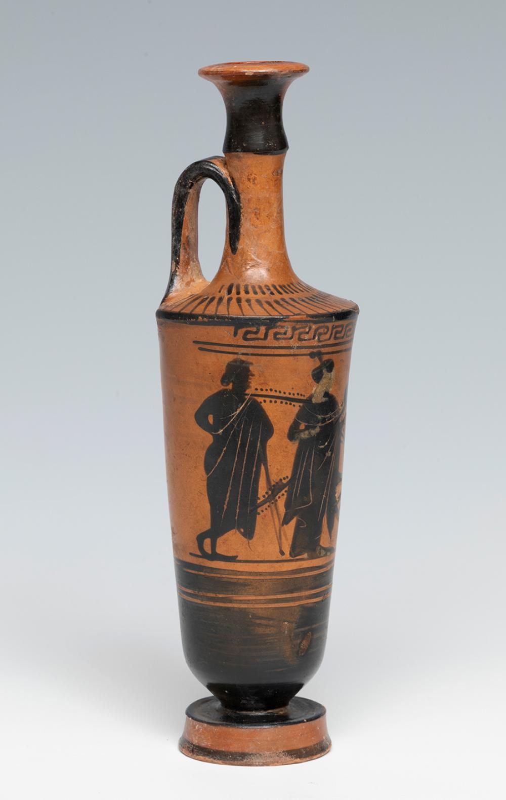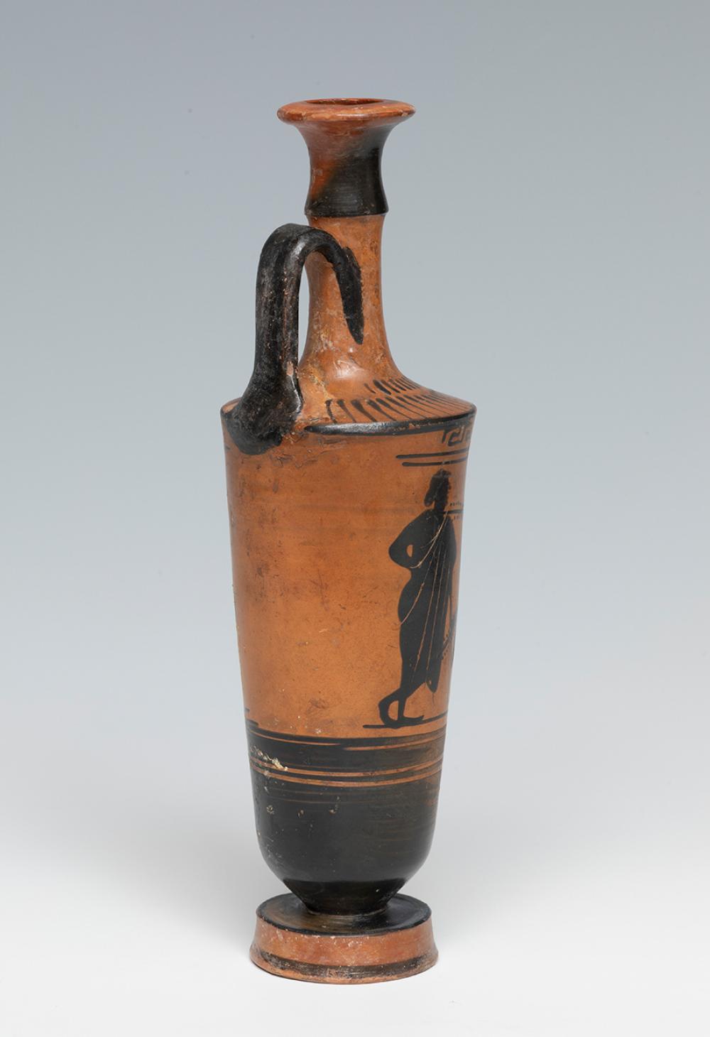 Lekythos ático elaborado mediante la técnica de figuras negras. Utilizado para almacenar aceites corporales.De cuerpo cónico, hombro ancho, cuello esbelto, asa en forma de D y base discoidal. Finamente pintado mediante la técnica de figuras negras, con amplios detalles incisos y detalles pintados en blanco. Presenta un friso figurativo compuesto por una escena de una figura femenina drapeada, flanqueada por dos figuras masculinas enfrentadas vestidas con himation. Una columna detrás de la figura izquierda. Rayos radiales alrededor del hombro y friso de meandro griego.