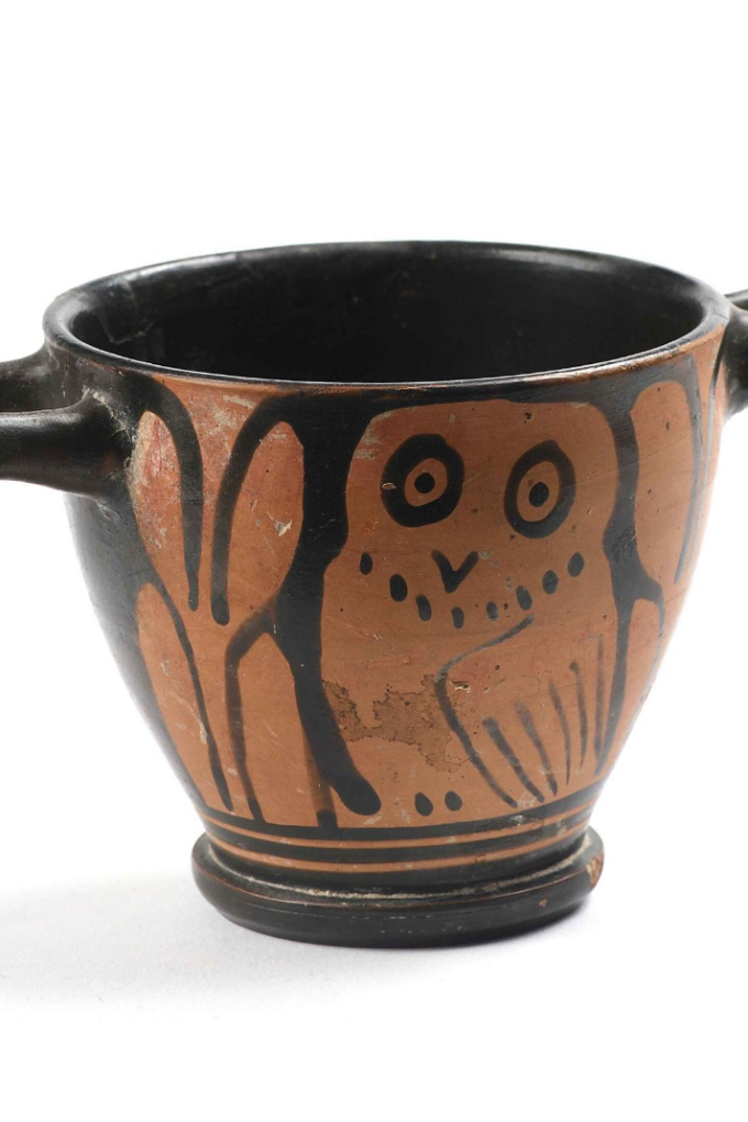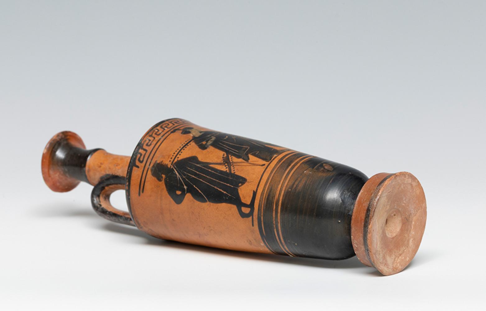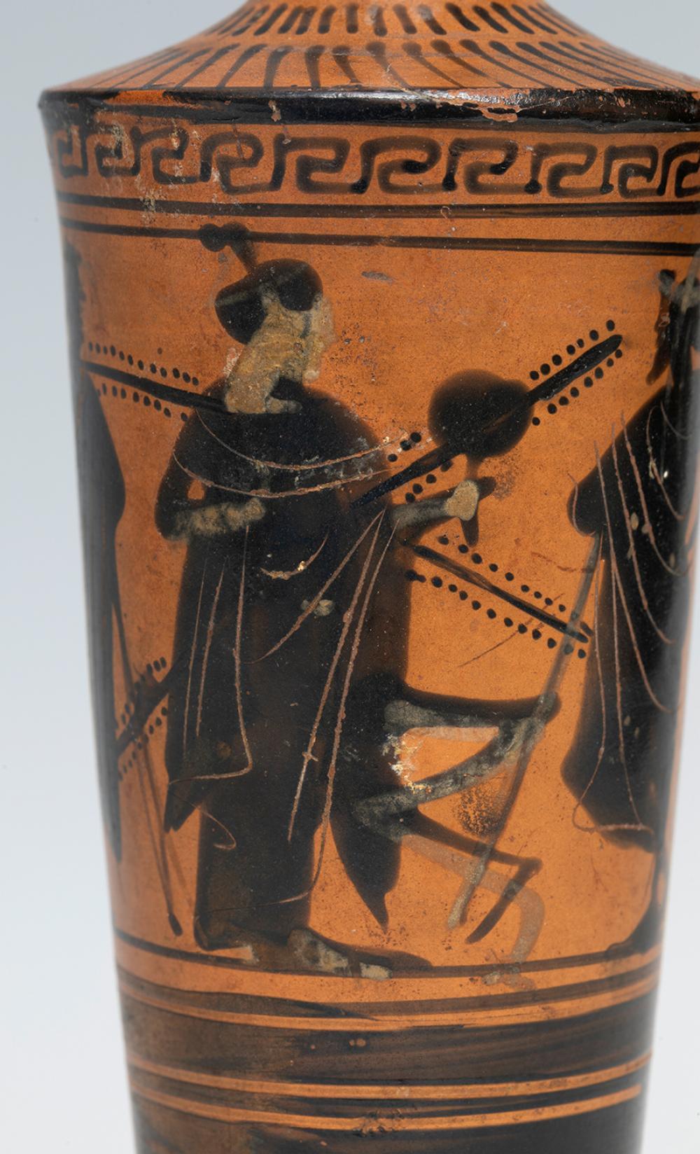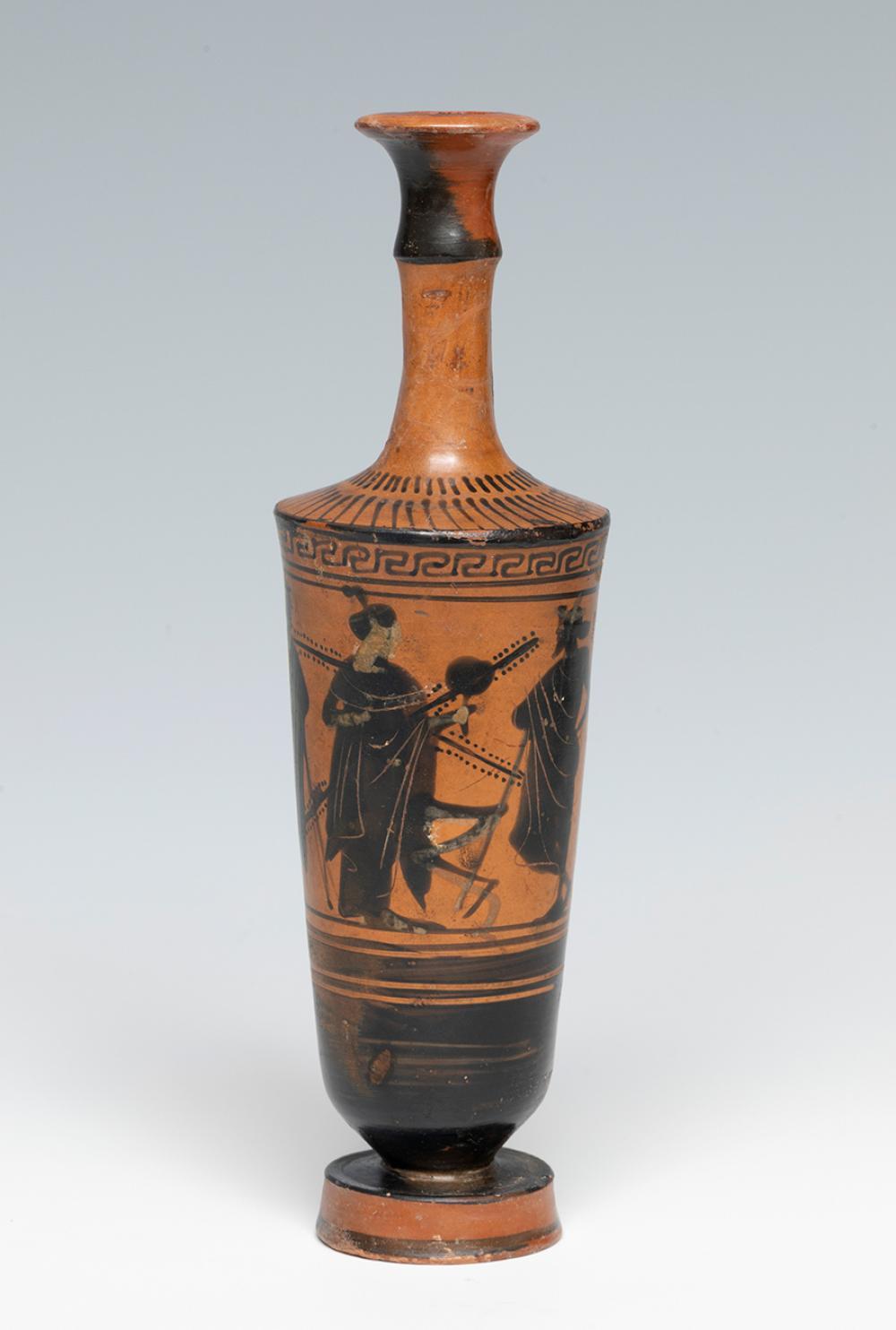 Lekythos ático elaborado mediante la técnica de figuras negras. Utilizado para almacenar aceites corporales.De cuerpo cónico, hombro ancho, cuello esbelto, asa en forma de D y base discoidal. Finamente pintado mediante la técnica de figuras negras, con amplios detalles incisos y detalles pintados en blanco. Presenta un friso figurativo compuesto por una escena de una figura femenina drapeada, flanqueada por dos figuras masculinas enfrentadas vestidas con himation. Una columna detrás de la figura izquierda. Rayos radiales alrededor del hombro y friso de meandro griego.