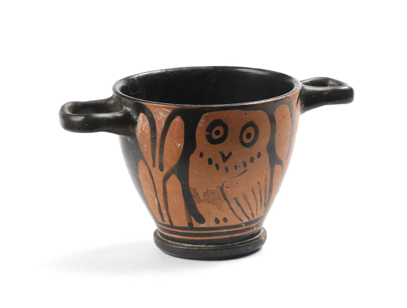 Pequeño skyphos de asas horizontales elaborado en cerámica mediante la técnica de figuras rojas. Decorado con dos figuras de búhos enmarcados por hojas de mirto bajo las asas. El skyphos era una taza de vino profunda, de origen corintio, con dos asas y una base baja y ancha. Las asas eran pequeñas y horizontales, proyectadas desde el borde.